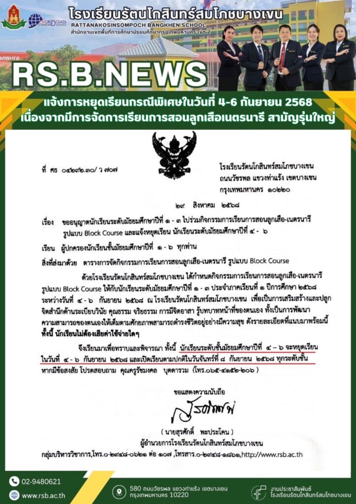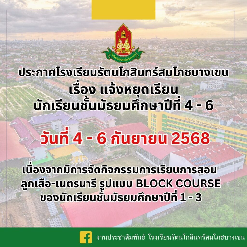 ประกาศโรงเรียนรัตนโกสินทร์สมโภชบางเขน เรื่อง แจ้งหยุดเรียนนักเรียนชั้นมัธยมศึกษาปีที่ 4 – 6 เนื่องจากมีการจัดกิจกรรมการเรียนการสอนลูกเสือ – เนตรนารี รูปแบบ Block Course ของนักเรียนชั้นมัธยมศึกษาปีที่ 1 – 3 ในวันที่ 4 – 6 กันยายน 2568 และเปิดเรียนตามปกติในวันที่ 8 กันยายน 2568