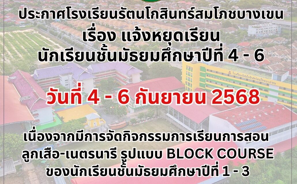 ประกาศโรงเรียนรัตนโกสินทร์สมโภชบางเขน เรื่อง แจ้งหยุดเรียนนักเรียนชั้นมัธยมศึกษาปีที่ 4 – 6 เนื่องจากมีการจัดกิจกรรมการเรียนการสอนลูกเสือ – เนตรนารี รูปแบบ Block Course ของนักเรียนชั้นมัธยมศึกษาปีที่ 1 – 3 ในวันที่ 4 – 6 กันยายน 2568 และเปิดเรียนตามปกติในวันที่ 8 กันยายน 2568