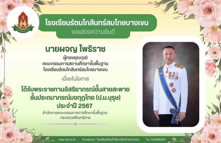 โรงเรียนรัตนโกสินทร์สมโภชบางเขน ขอแสดงความยินดีอย่างยิ่ง 🎉แด่ นายผจญ โพธิราชผู้ทรงคุณวุฒิ คณะกรรมการสถานศึกษาขั้นพื้นฐานในโอกาสได้รับพระราชทาน อิสริยาภรณ์ชั้นสายสะพาย ประถมาภรณ์มงกุฎไทย (ป.ม.)ประจำปี พ.ศ. 2567โดยpornthep boonmaวันที่22 พฤศจิกายน 256822 พฤศจิกายน 2025